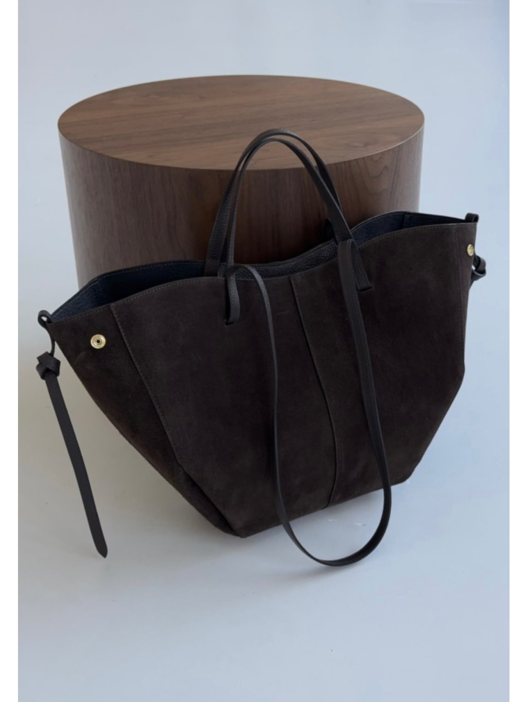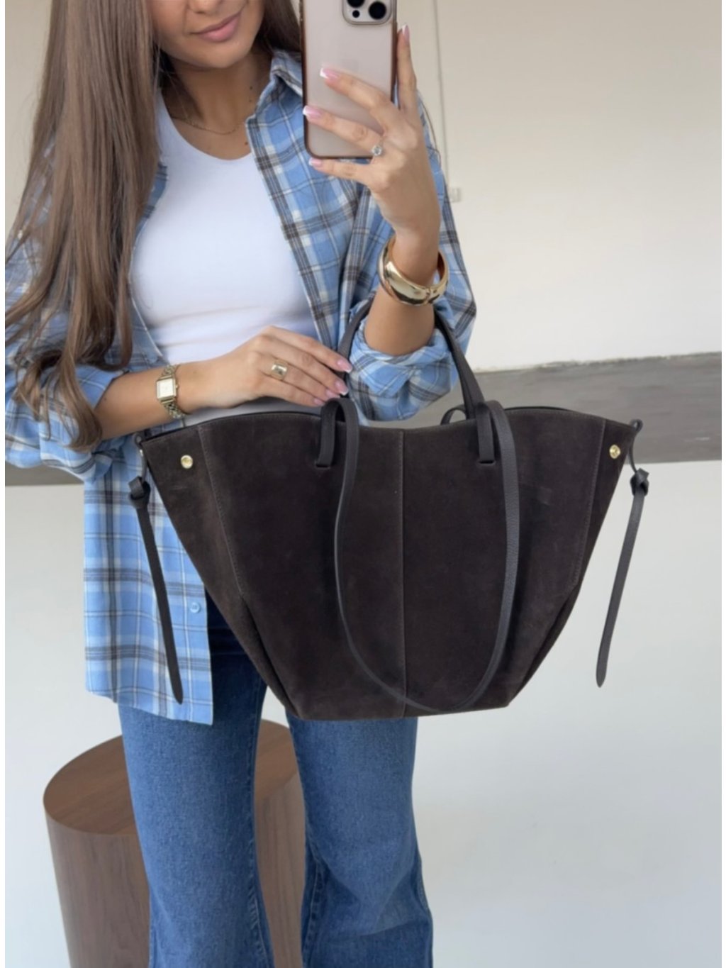 PREMIUM. Vyrobeno v Itálii. Luxusní kabelka z pravé saude kůže v populárním čokoládovém odstínu. Zlaté detaily - patenty a zip na horní straně. Zapínání na horní zlatý zip. Propracované detaily a pevný tvar. Kabelku lze nosit i přes rameno s delším popruhem. Pevně drží svůj tvar i dno. Největší velikost kabelky, do které se vejde opravdu vše nezbytné - notebook, kosmetická taška, atd. Součástí kabelky je uvnitř i kosmetická vyjímatelná taška. Kabelku lze stáhnout bočními patenty na menší velikost.