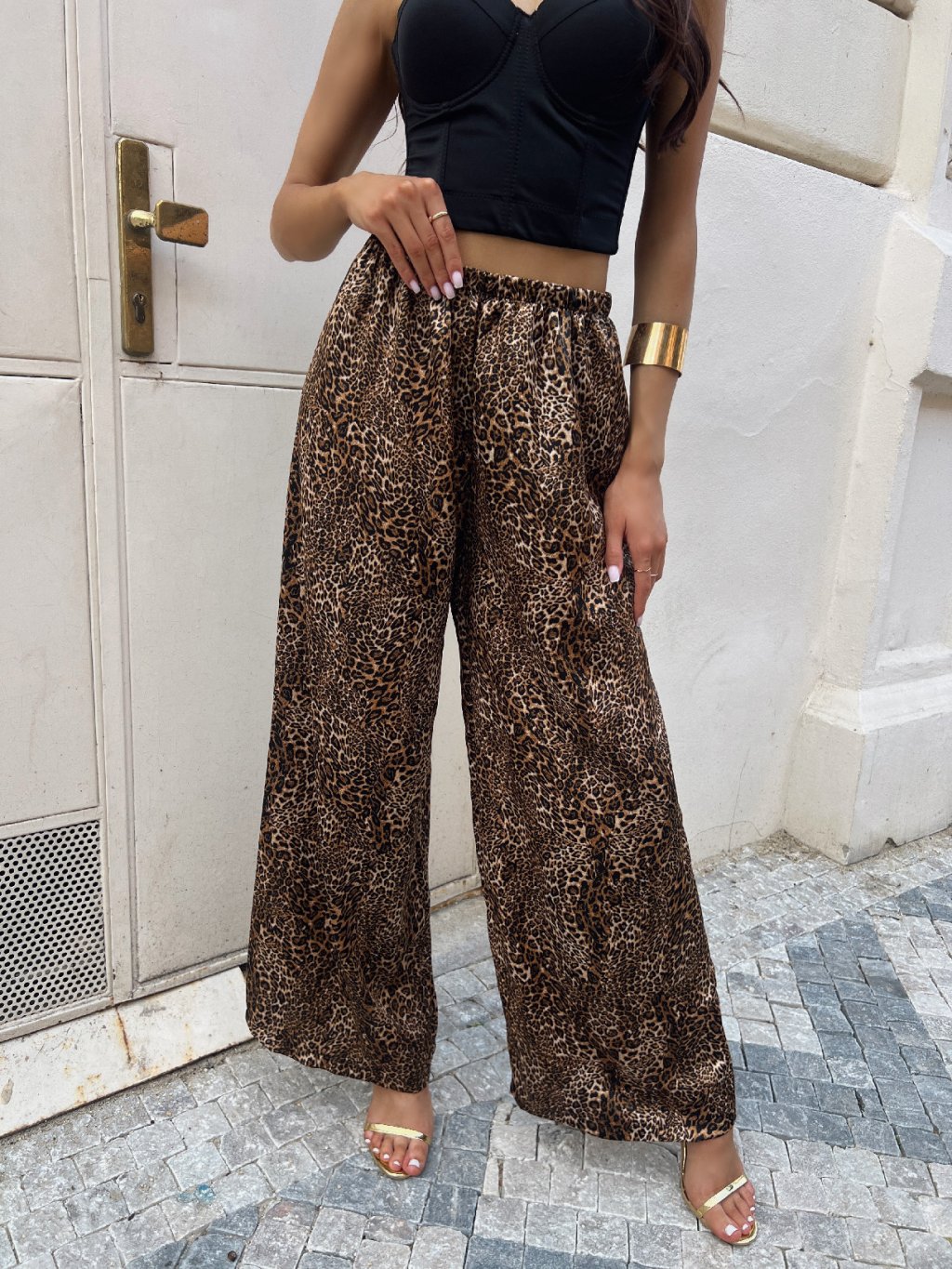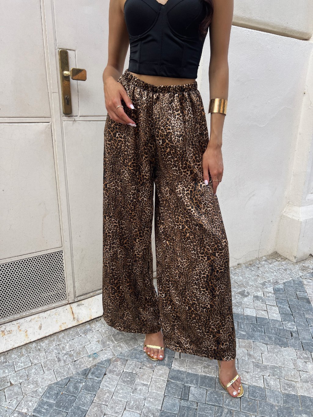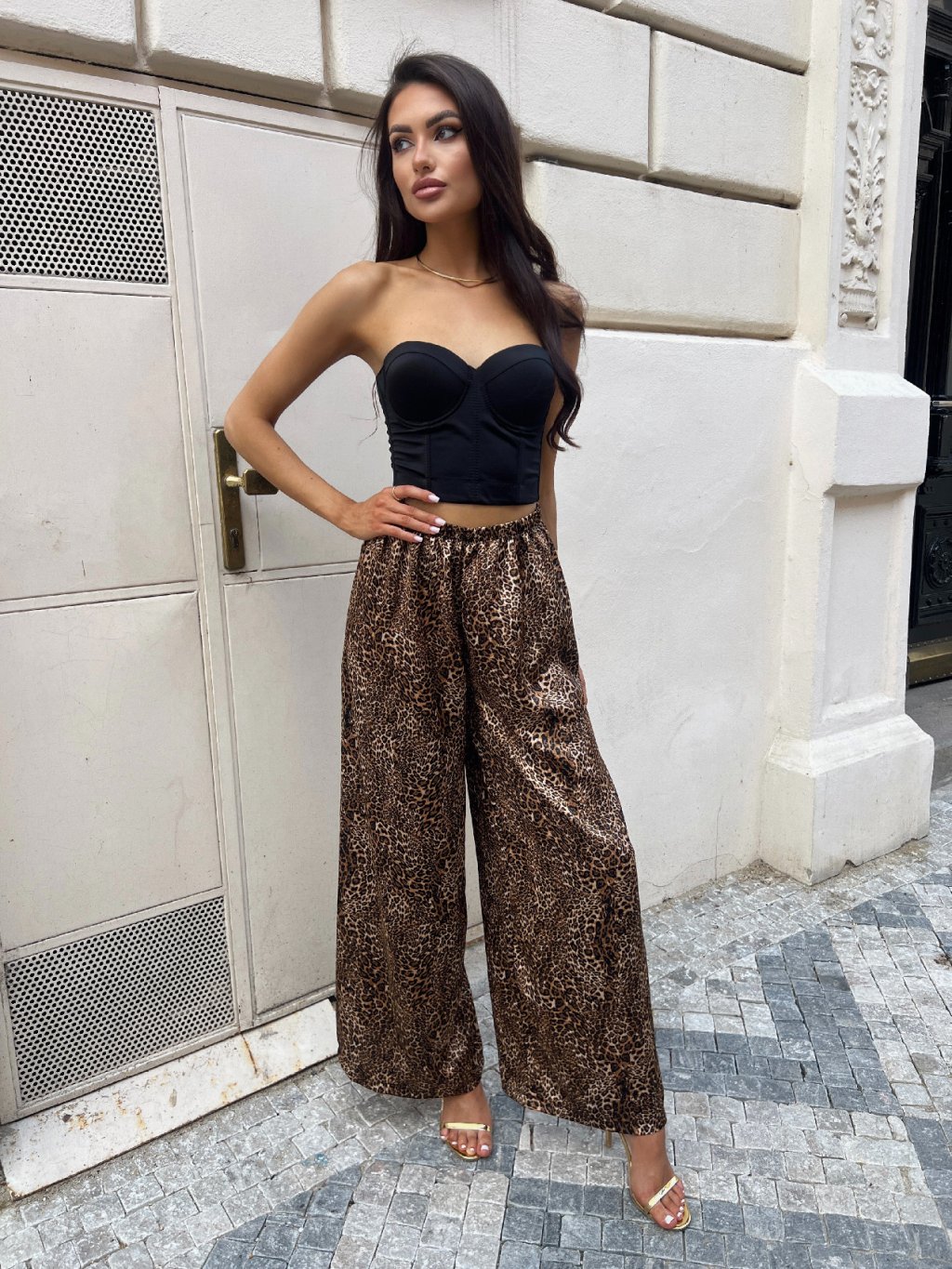 Vyrobeno v Itálii. Trend léta 2024. Stylové saténové kalhoty v leopardím vzhledu. Saténový vzhled a vzdušný materiál. V pase je elastická guma, díky které jsou příjemné na nošení. Modelka měří 170 cm a běžně nosí velikost S.