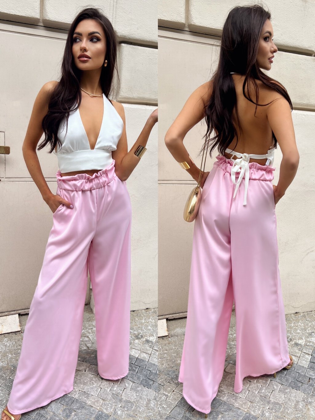 Ušito v Itálii. Saténové kvalitní kalhoty s doplněné v pase elegantním řasením v jemném odstínu růžové. V pase je elastická guma. Kalhoty jsou vzdušné a vhodné na denní letní nošení. Snadno kombinovatelné. Po stranách elegantní hluboké kapsy. Materiál je pevné struktury a méně náchylný na. Doporučujeme na velikost XS, S, M i L. Modelka běžně nosí velikost XS/S a měří 170 cm.