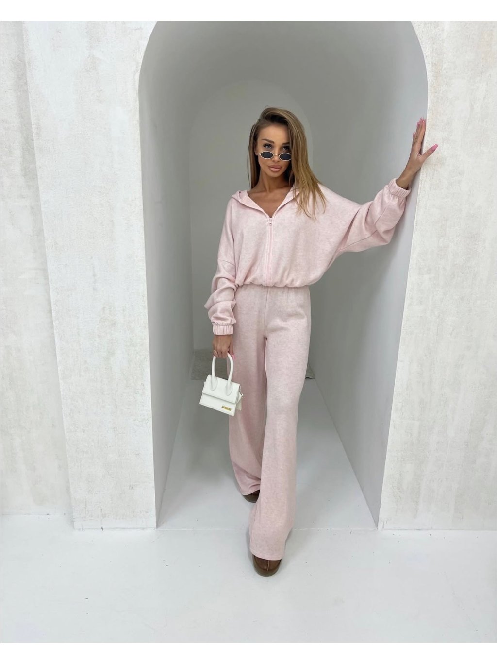 Vyrobeno v Polsku. Kolekce jaro 2026. Luxusní jemně růžový komplet kalhot a mikiny. Extrémně pohodlný a hebký materiál. Mikina i tepláky jsou bez kapes. Kvalitní detaily a zpracování. Velikost sedí na XS, S, M. Modelka běžně nosí velikost S a měří 170 cm.