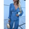 Premium kvalita. Kvalitní stylový plisovaný komplet v nádherném modrém neobvyklém odstínu. Složený z halenky s páskem a kalhot. Elastická guma v pase. Vhodné i na větší poprsí. Perfektní kvalitní nadčasový kousek, který lze vynosit i odděleně. Vybírejte svou běžnou velikost, pro volnější vzhled o číslo větší. Modelka měří 167 cm a běžně nosí velikost S, obléká velikost S.
