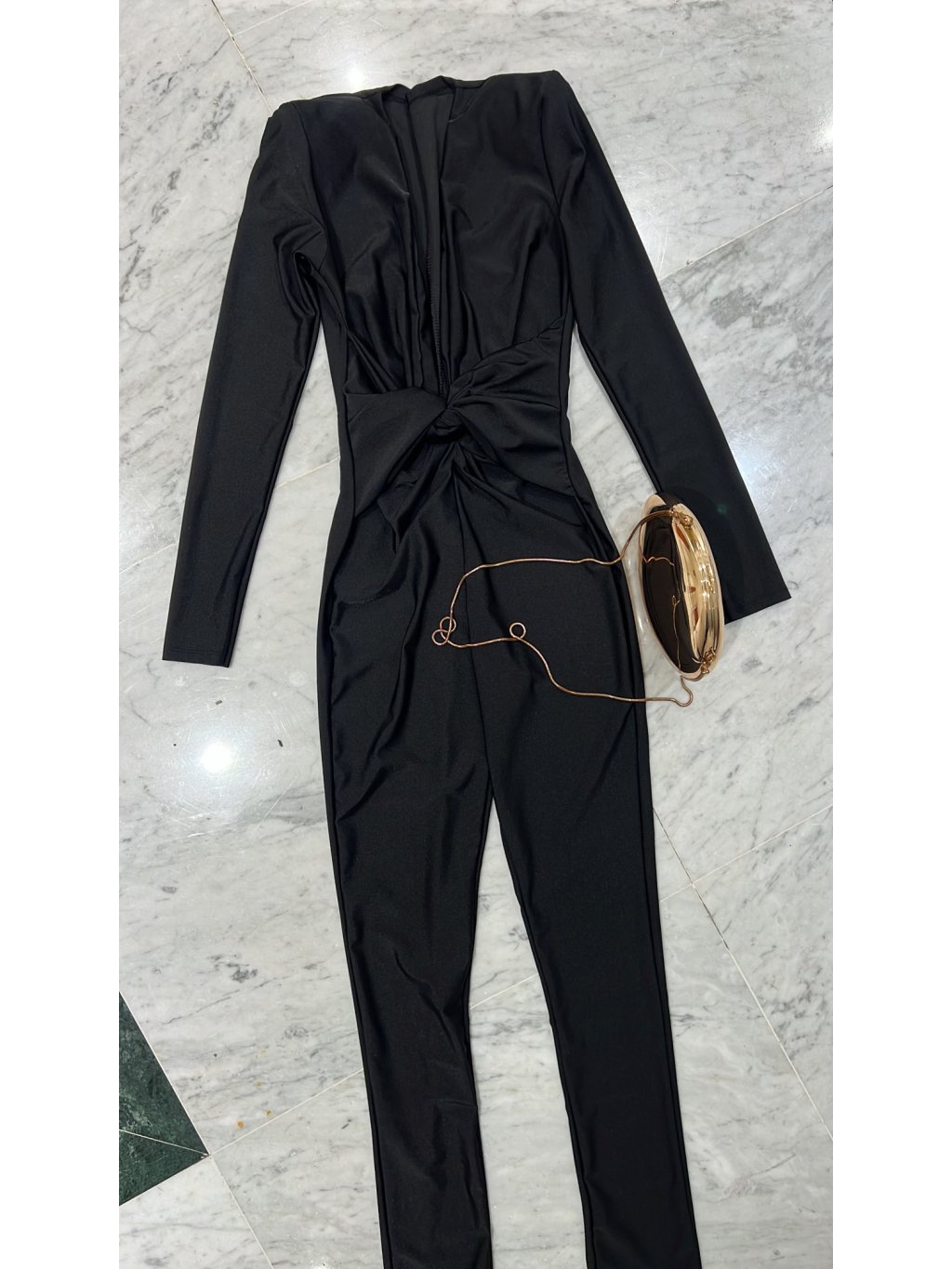 Vyrobeno v Itálii. Sexy elastický černý overal s jemným leskem. Bohaté ramenní vycpávky, které vytvoří elegantní dojem. Otevřená oblast dekoltu. Pohodlný na nošení. Vhodné i na větší poprsí - látka lze nastavit tak, aby nesjížděla. Velikost sedí na XS, S, M. Modelka běžně nosí velikost S a měří 170 cm.