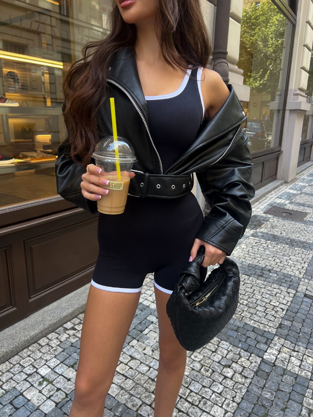 Vyrobeno v Itálii. Stahující overal s bílým lemem. Zadní strana má vystuženou push up část pozadí a vytvaruje tak krásné pozadí. Materiál je stahující a elastický. Vhodný na denní nošení i sportovní aktivity - fitko, pilates, atd. Pohodlná struktura. Modelka měří 170 cm a běžně nosí velikost S.