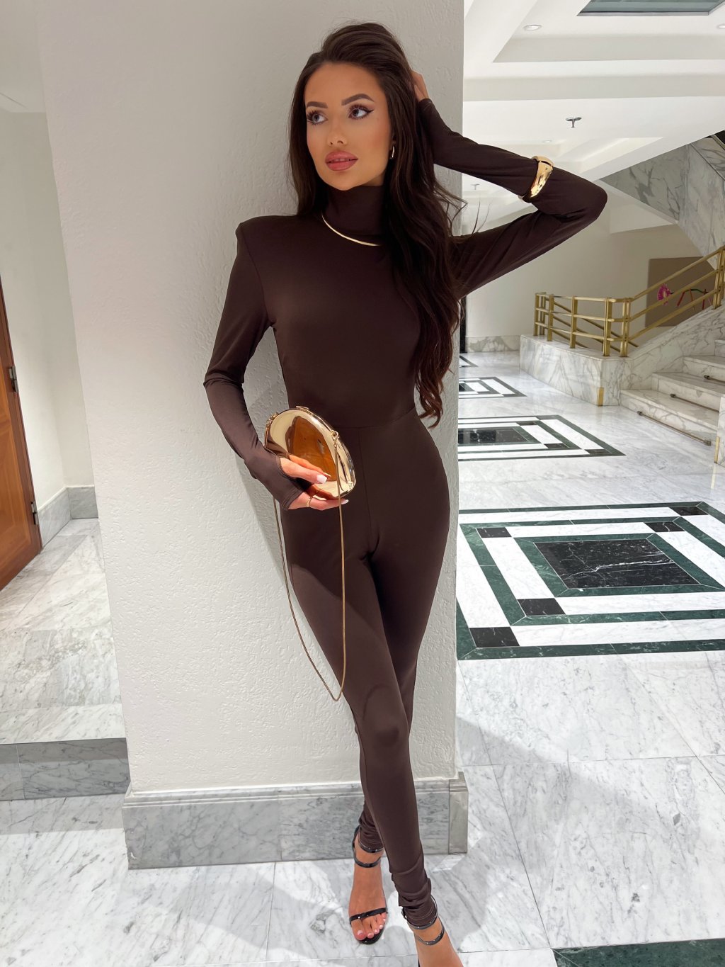 Vyrobeno v Itálii. Luxusní overal s vypasovanými rameny. Zapínání na zadní straně na jemný zip. Čokoládový populární odstín. Overal lze nosit i na přední straně se zipem - je oboustranný. Elastická legínová struktura, která neprosvítá. Velmi příjemný a pohodlný na nošení. Overal hezky stáhne v oblasti pase a vytvoří křivky. Zakončení rukávu lze nosit přes palec nebo klasicky. Modelka běžně nosí velikost S a měří 170 cm.