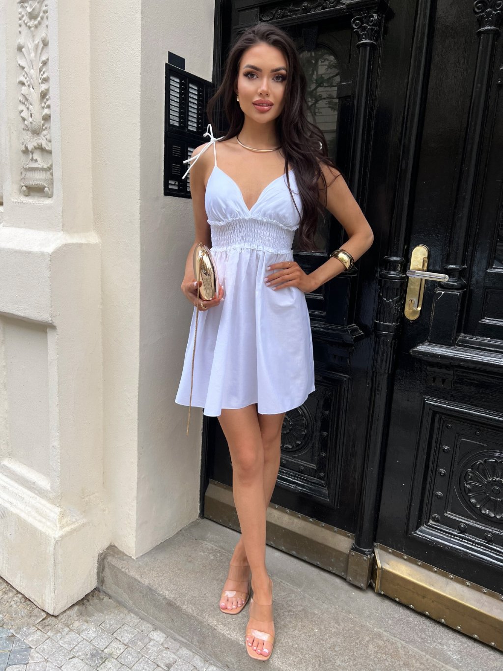 Vyrobeno v Itálii. Populární bavlněné šaty s uzlíkama na ramenou. Oblast prsou je vystužená. Ramínka jsou pružná a zavazování je dle pohodlnosti. V oblasti rpsou jsou pružné díky řasení s gumou na zadní straně a jsou tak vhodné i pro širší hrudník. Materiál je vzdušný a lehký z prodyšné bavlny. Modelka měří 170 cm a běžně nosí velikost S.