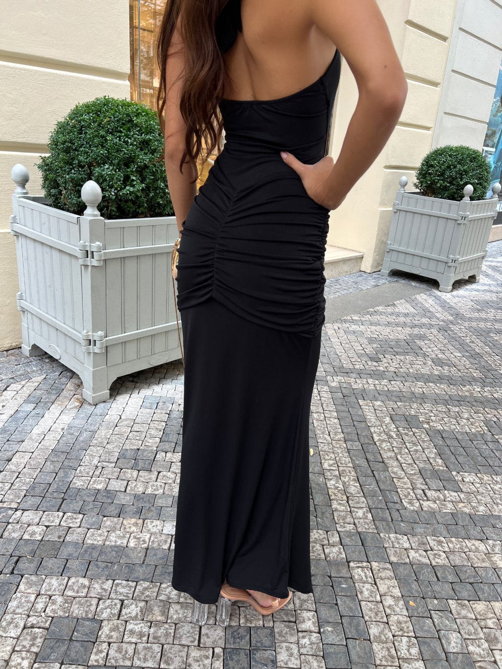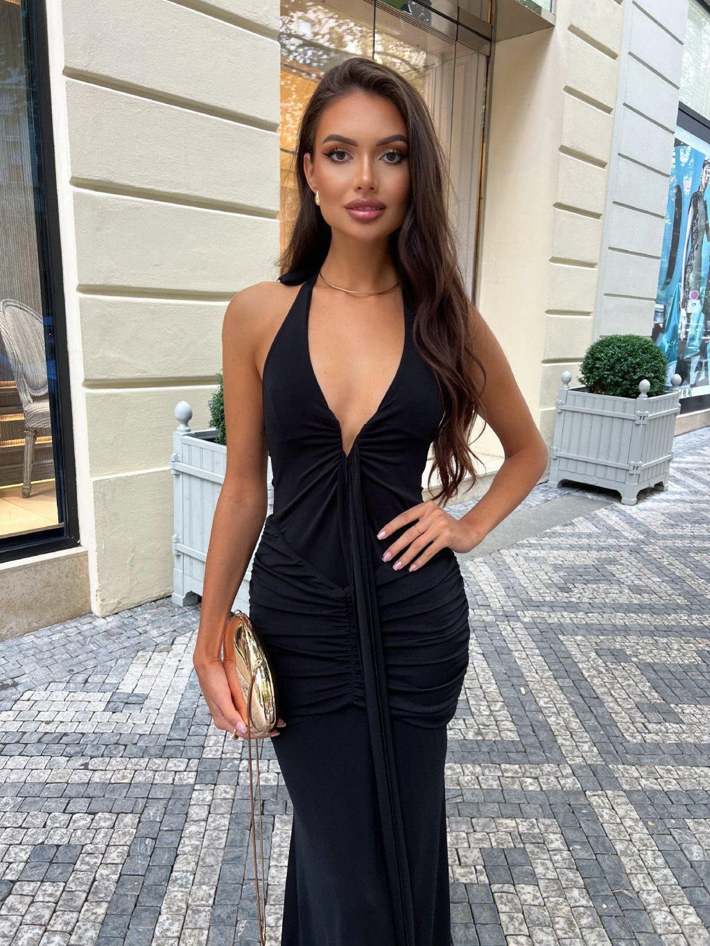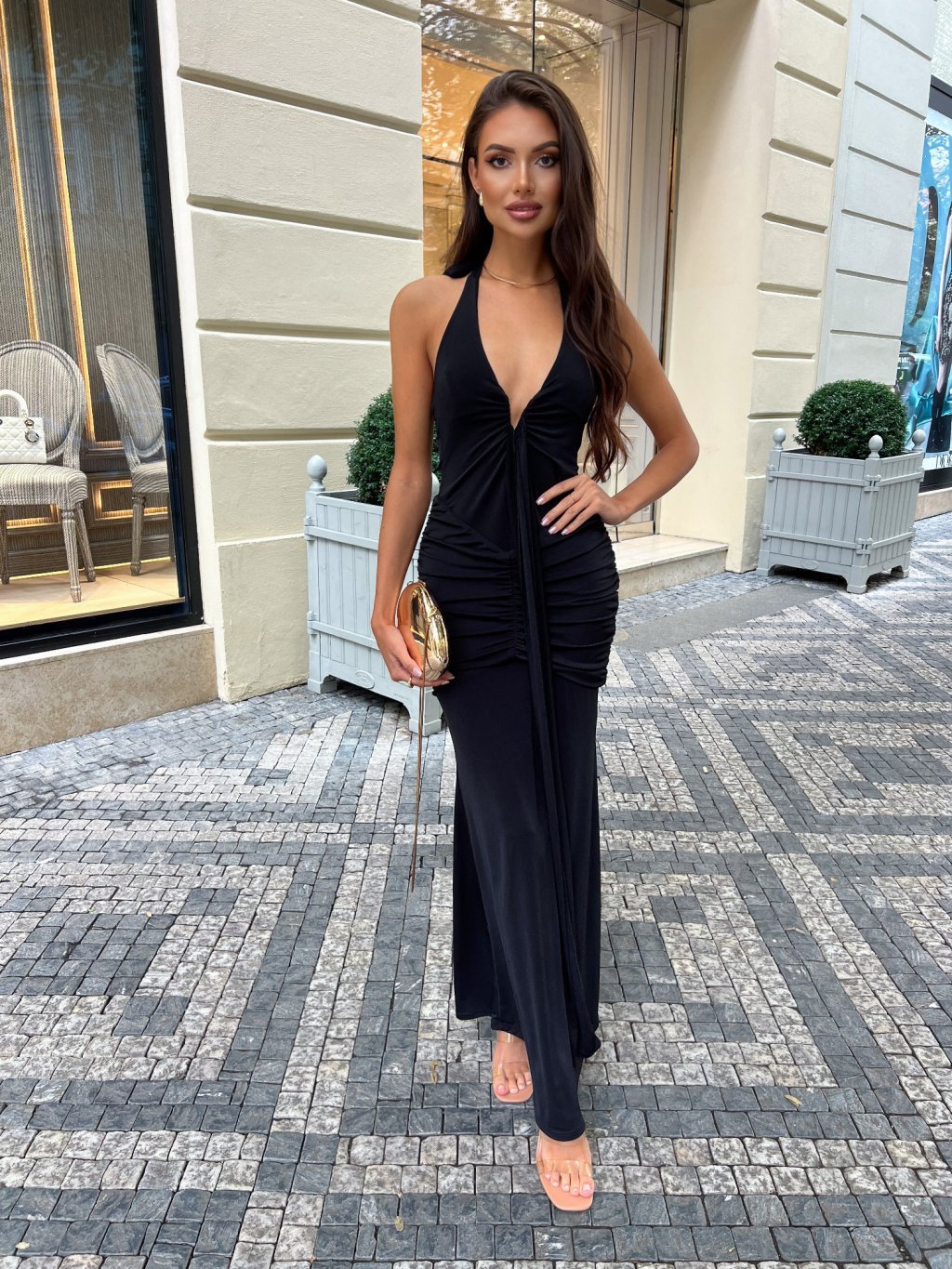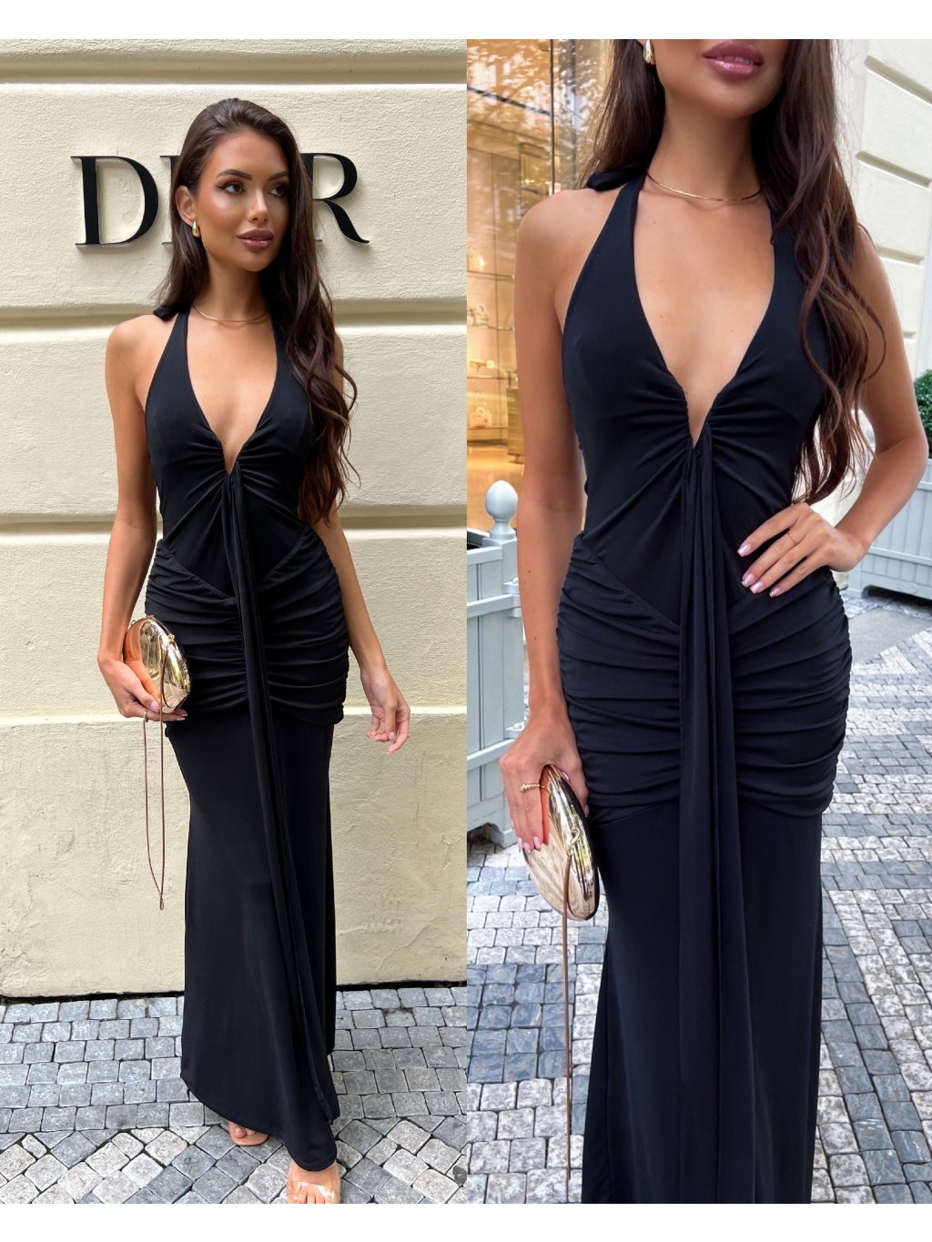 Vyrobeno v Itálii. Nádherné černé šaty s řasením a bočním rozparkem. Oblast dekoltu je vyplněná sponou, která drží tvar prsou. Vytváří krásnou a sexy postavu. Šaty mají dvojí látku po celé délce. Kvalitní zpracování a detaily. Zavazování za krkem dle pohodlnosti. Modelka měří 170 cm a běžně nosí velikost S.
