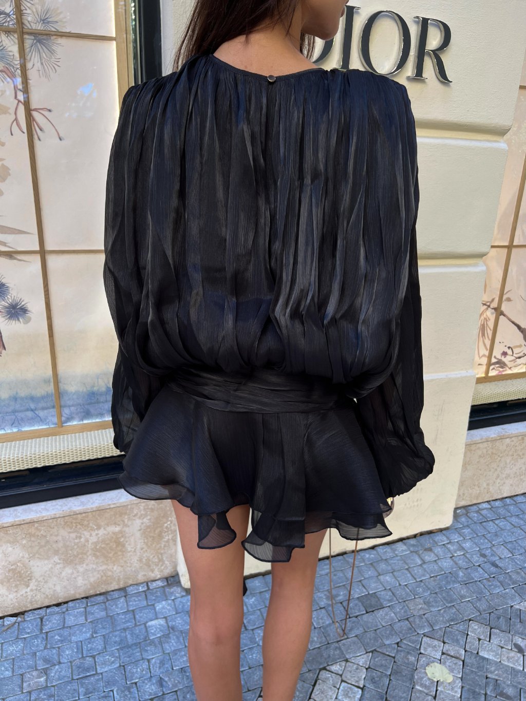 PREMIUM kvalita. Made in Paris. Populární šaty ve světě v perleťovém černém odstínu. Šaty působí luxusním dojmem. Vzdušný a jemný materiál. Neprosvítají. Zapínání kolem krku na zadní straně na krásný zlatý knoflík. Šaty nemají ramenní vycpávky a nepůsobí mohutným dojmem. Vybírejte svou běžnou velikost nebo pro volnější vzhled o číslo větší. Vhodné na společenské události - oslavu, svatbu nebo večeři. Modelka měří 170 cm a běžně nosí velikost S.
