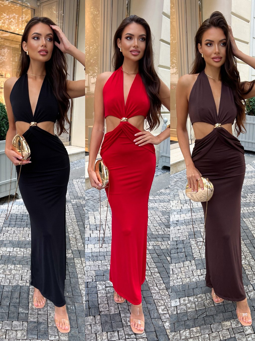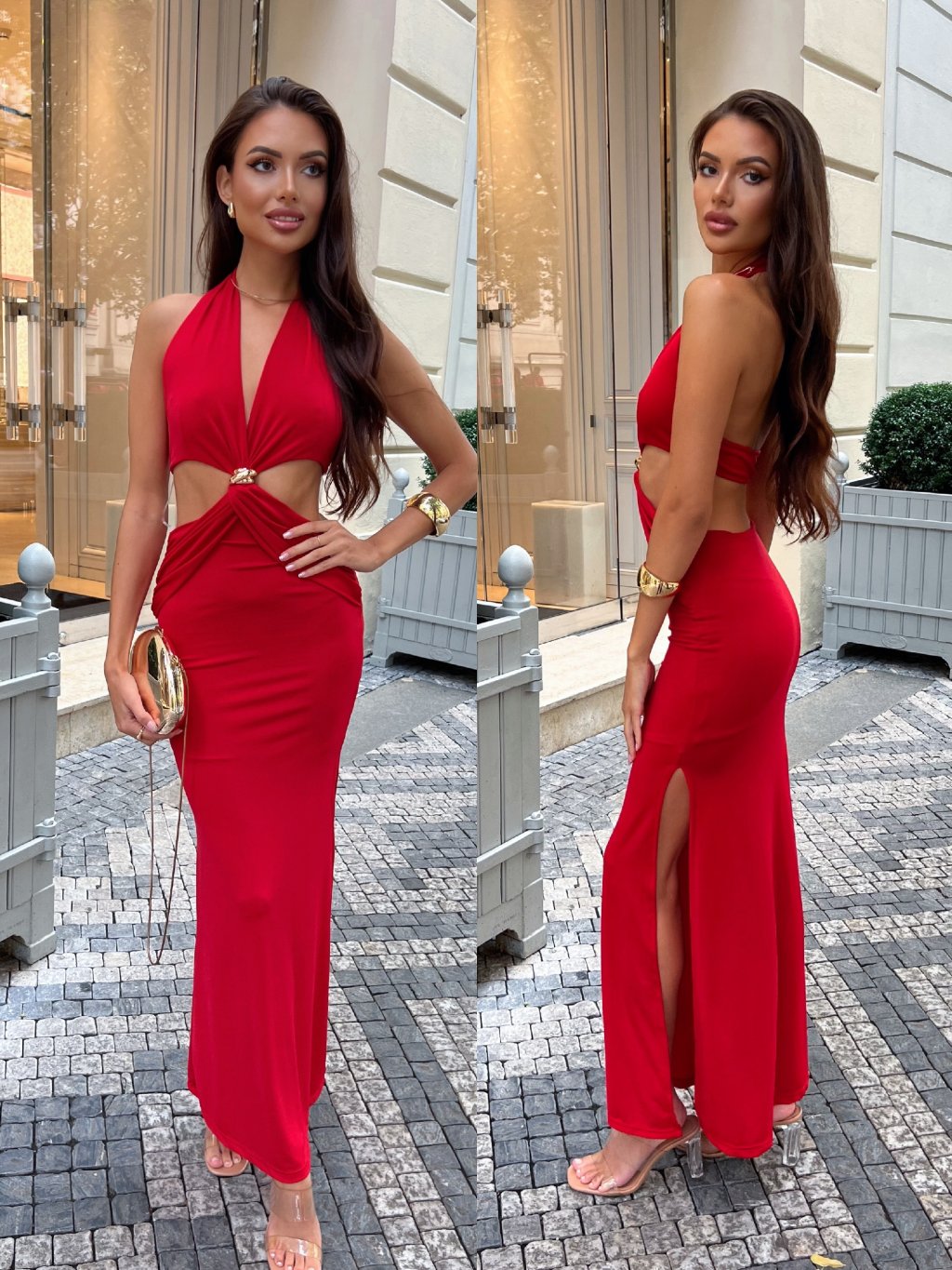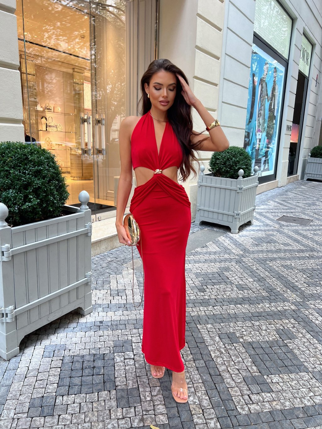 Vyrobeno v Itálii. Nádherné červené šaty se zlatou sponou. Boční rozparek. Dvojitá látka v oblasti dekoltu. Kvalitní zpracování a detaily. Šaty nabízíme také v černé a čokoládové. Modelka měří 170 cm a běžně nosí velikost S.