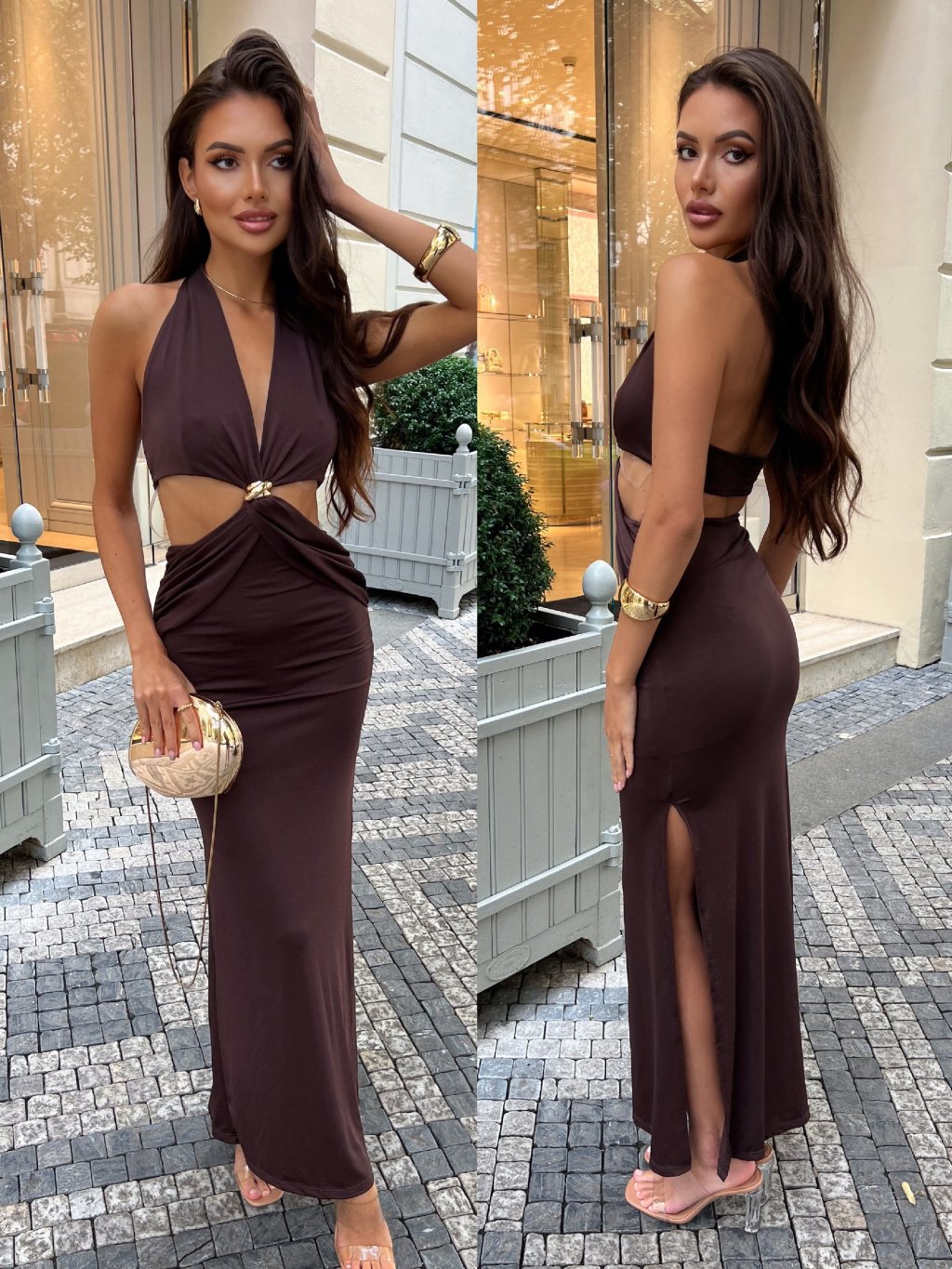 Vyrobeno v Itálii. Nádherné čokoládové šaty se zlatou sponou. Boční rozparek. Dvojitá látka v oblasti dekoltu. Kvalitní zpracování a detaily. Šaty nabízíme také v černé a červené. Modelka měří 170 cm a běžně nosí velikost S.