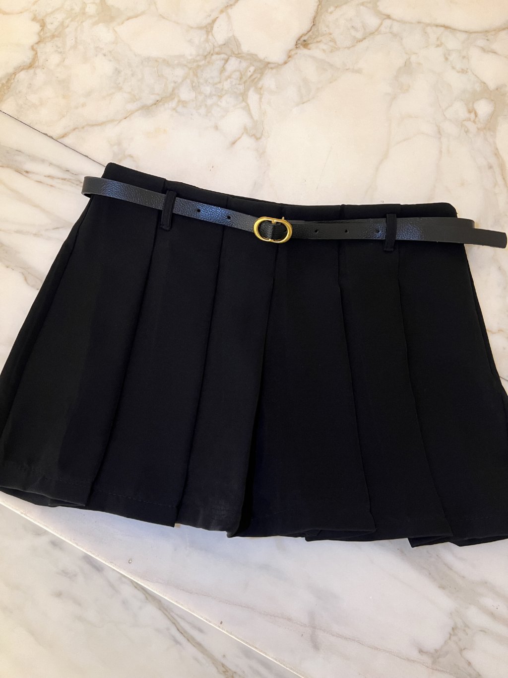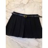 Vyrobeno v Itálii. Elegantní skládaná skort sukně ze sakového materiálu, zadní strana má vzhled šortek. Pásek se zlatou sponou je součástí. Doporučujeme vybírat běžnou velikost. Modelka běžně nosí velikost S, obléká velikost S a měří 170 cm.