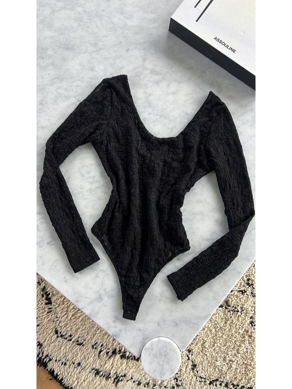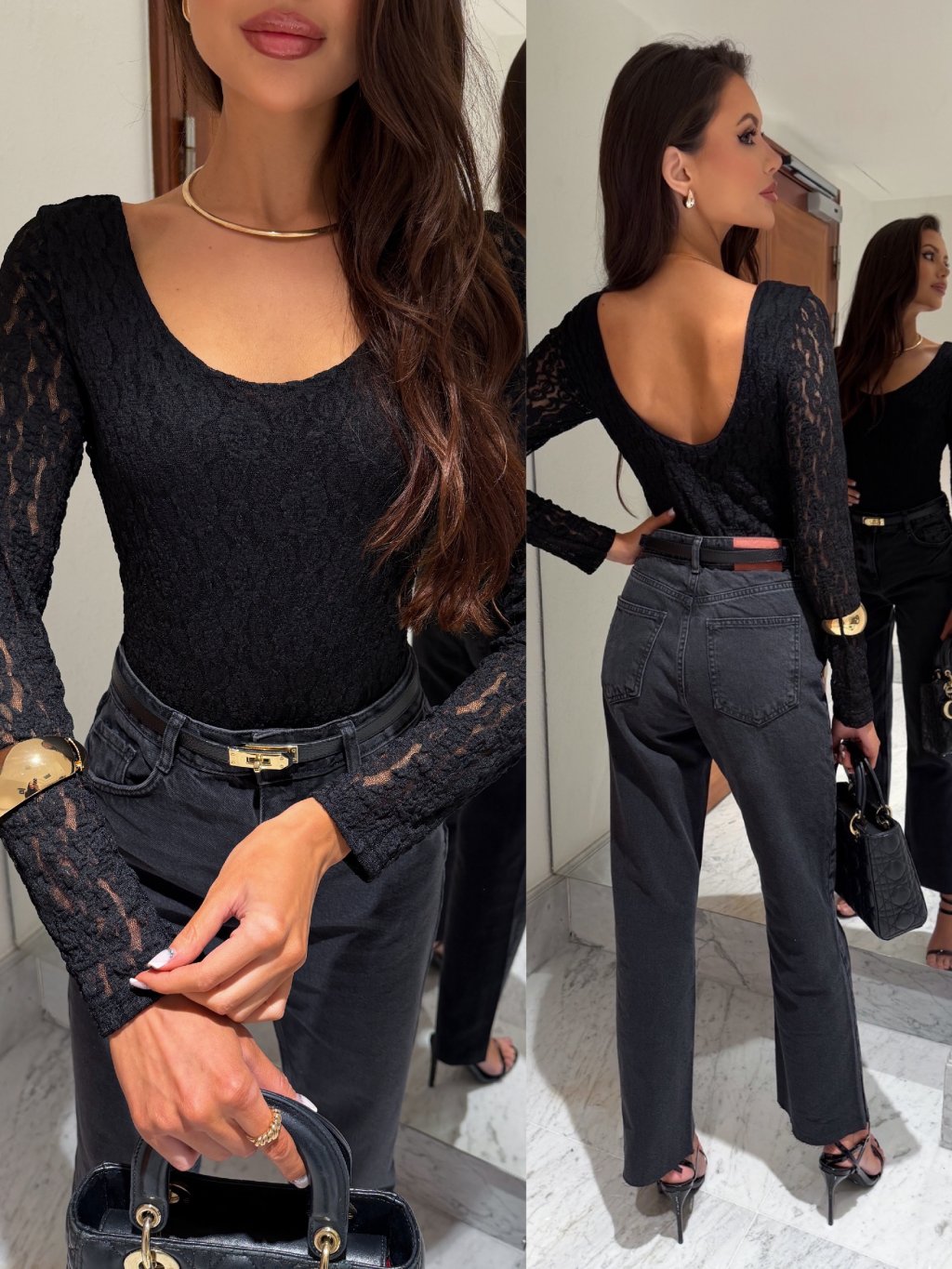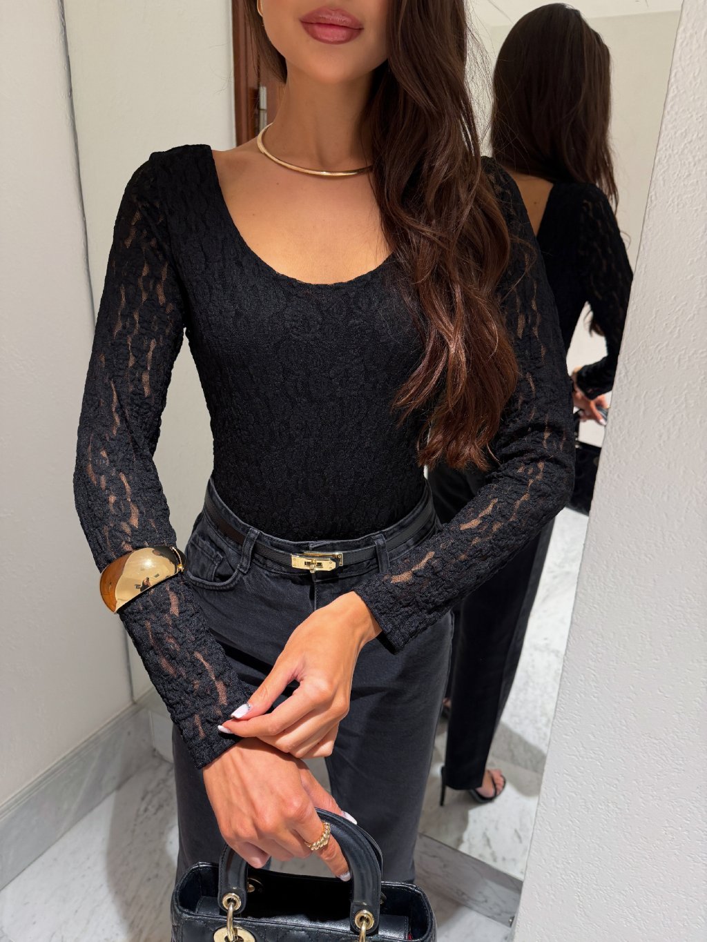 Vyrobeno v Itálii. Krajkové kvalitní body s viskózovou podšívkou. Rukáv je bez podšívky a prosvítá pokožka. Oblast prsou po spodní část je vyplněna černou podšívkou - látka neprosvítá. Struktura je elastická. Výstřih do oblouku i na zadní straně. Zapínání na spodní straně na tři polohovatelné velikosti.