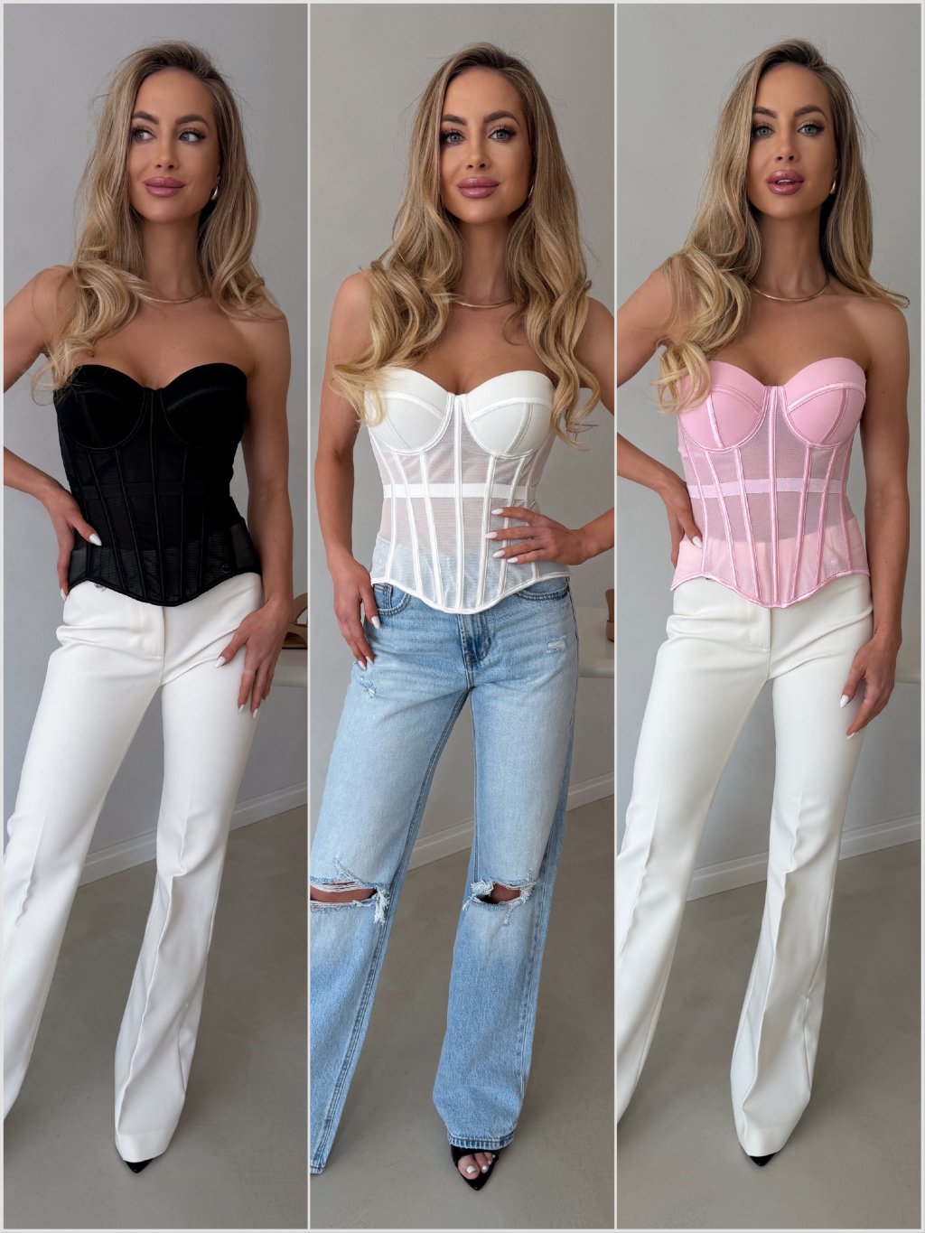 Vyrobeno v Itálii. Korzetový top s kosticemi v krásných základních odstínech. Vytváří stahující pas díky detailu v pase. Košíček je již vystužený. Nastavitelná ramínka dle velikosti, která lze i odepnout jako ramínka od podprsenky. Zadní strana zapínání na čtyři polohovatelné velikosti. Korzet doporučujeme na velikost A, B, C, D. Tento typ korzetu je vhodný i na větší poprsí ve velikosti, košíček je dost hluboký.