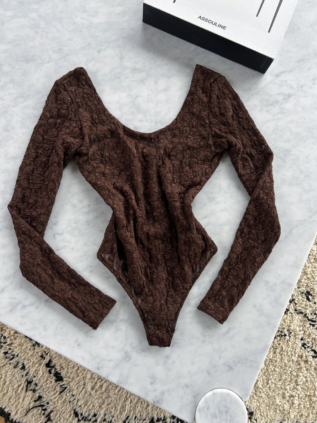 Vyrobeno v Itálii. Krajkové kvalitní body s viskózovou podšívkou. Rukáv je bez podšívky a prosvítá pokožka. Oblast prsou po spodní část je vyplněna hnědou podšívkou - látka neprosvítá. Struktura je elastická. Výstřih do oblouku i na zadní straně. Zapínání na spodní straně na tři polohovatelné velikosti.
